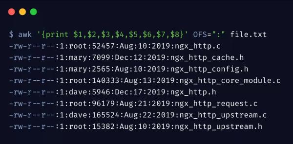 同样,awk 可以指定输出时的分隔符,通过 OFS 变量来设置