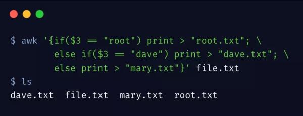 复杂的条件判断,可以使用 awk 的 if 语句,awk 的强大正因为它是个脚本解释器,拥有一般脚本语言的编程能力,下边示例通过稍微复杂的条件进行拆分文件
