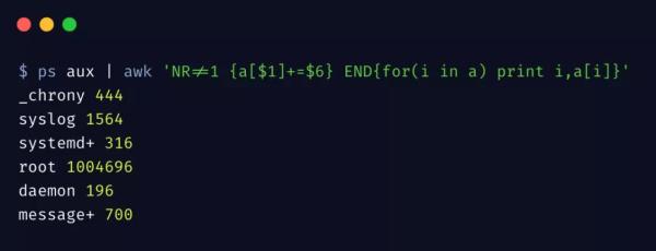 再来看一个例子,统计每个用户的进程占用了多少内存,注意取值的是 RSS 那一列