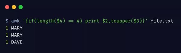 awk 内置支持一系列的字符串函数,length 计算字符串长度,toupper 函数转换字符串为大写。