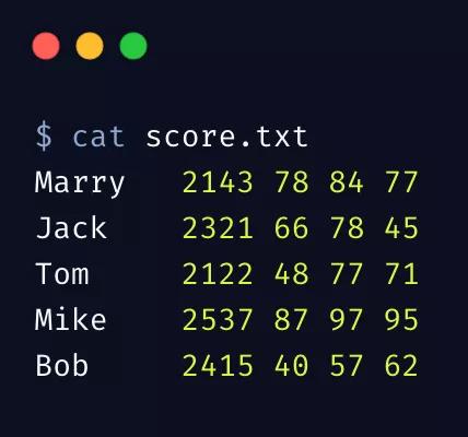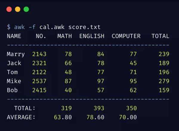 为了从整体上理解 awk 工作机制,我们再来看一个综合的示例,假设有一个学生成绩单: