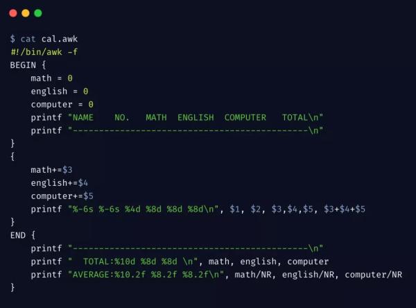 我们可以将复杂的 awk 语句写入脚本文件 cal.awk,然后通过 -f 选项指定从脚本文件执行。