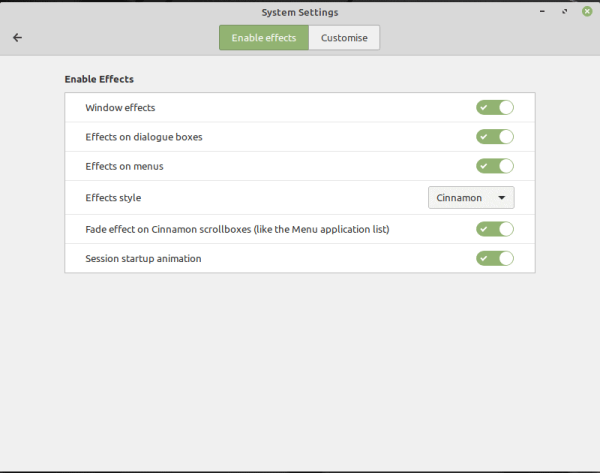 效果选项简单,不言自明,一目了然。你可以开启或关闭桌面不同元素的特效,或者通过改变特效风格来改变窗口过渡。如果你想改变效果的速度,可以通过自定义标签来实现。