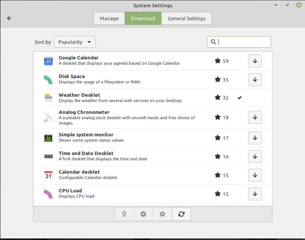 Cinnamon 小程序是所有包含在底部面板的元素,如日历或键盘布局切换器。在管理选项卡中,你可以添加/删除已经安装的小程序。