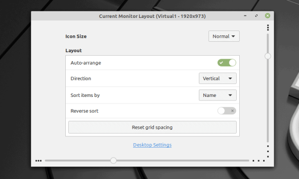 此外,如果你点击“桌面设置”,将显示更多的选项。你可以禁用桌面上的图标,将它们放在主显示器或副显示器上,甚至两个都可以。如你所见,你可以选择一些图标出现在桌面上。