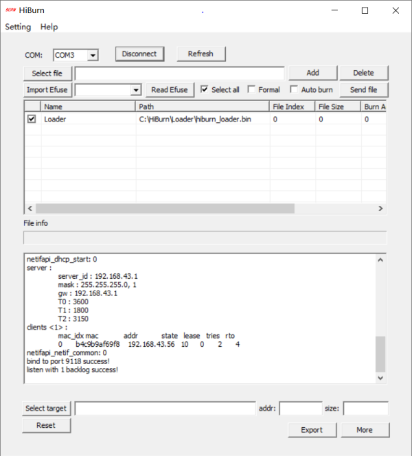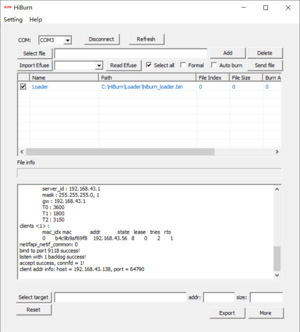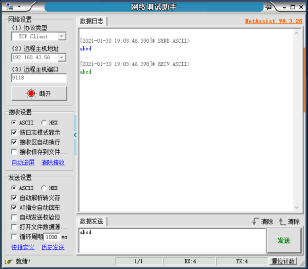 2、TcpClient(网络调试助手)连接开发板的TcpServer(HiBurn)。