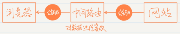 那么,上述的工作机制你认为已经非常完善了吗?其实并没有,因为我们还是差了非常关键的一步,浏览器该怎样才能获取到网站的公钥呢?虽然公钥是属于公开的数据,在网络上传输不怕被别人监听,但是如果公钥被别人篡改了怎么办?示意图如下: