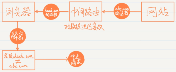 同样是刚才的例子,如果证书中加入了网站的域名,那么攻击者就只能无功而返了。因为,即使加密数据可以被成功解密,但是最终解密出来的证书中包含的域名和浏览器正在请求的域名对不上,那么此时浏览器仍然会显示异常界面。示意图如下: