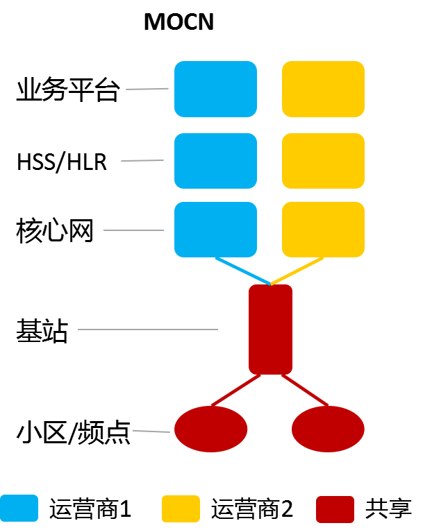 这种方式的共享又比MORAN更近了一步,不但共享了无线接入网的主设备——基站硬件本身,还把基站内部和无线接入资源相关最关键的模块:小区和频点也共享了。也就是说,多个网络共享的运营商将共用小区和频谱。