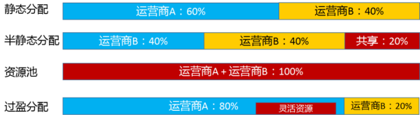 资源池:各运营商完全共享资源,没有任何保留,资源完全是按照业务量的多少,先占先得,用完释放。这种方式虽然灵活,但在实际分配实现上需要充分考虑公平性,避免饿死一家撑死一家这样局面的出现。