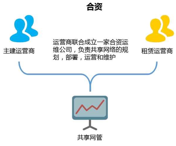或者,为了避免参与共享的运营商相互之间的推诿扯皮,提高网络运维效率,他们还可以共同出资成立一家合资运维公司,负责共享网络的规划,部署,运营和维护,如下图所示。