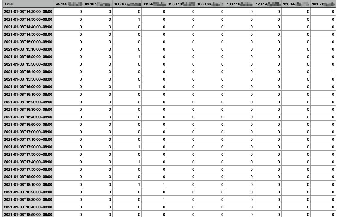 原始文件是多个csv表格,第一列为时间戳,每10分钟统计生成一行,其余列为ip地址在该时间段内的访问次数