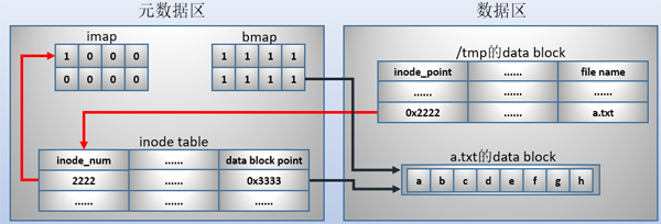 - ?在/tmp的data block中添加一条a.txt文件的记录。该记录中包括一个指向inode号的指针,例如"0x2222"。