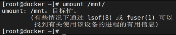 执行卸载命令:umount /mnt后,发现卸载不了,提示资源被占用,如下图所示: