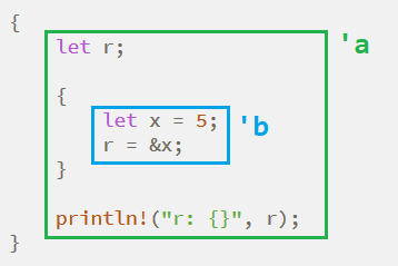 上图中的绿色范围 'a 表示 r 的生命周期,蓝色范围 'b 表示 x 的生命周期。很显然,'b 比 'a 小得多,引用必须在值的生命周期以内才有效。