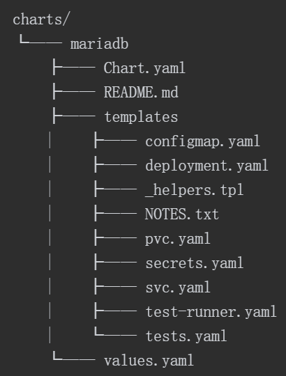 一个Charts就是按特定格式组织的目录结构,目录名即为Charts名,目录名称本身不包含版本信息。目录结构中除了charts/和templates/是目录之外,其他的都是文件。它们的基本功用如下。