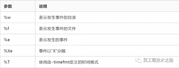 - -e 指定要监视的事件,多个时间使用逗号隔开