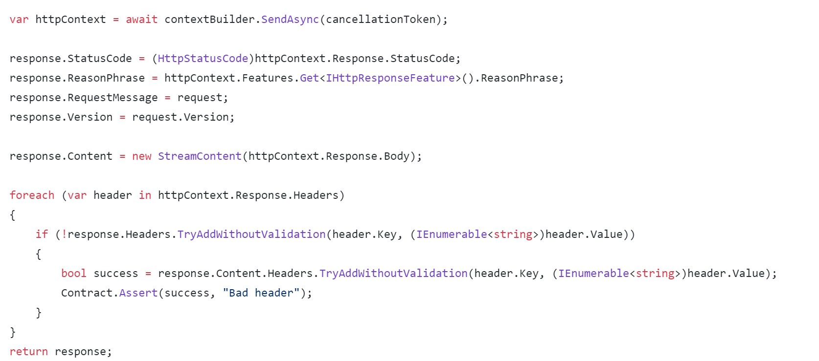 ClientHandler 重写了 HttpClientHandler 的 SendAsync 方法,使得请求直接拦截掉,不会真正的发生 Http 请求,实际的请求过程首先将 Http 请求的信息转换成 HttpRquestFeature 然后直接交给 TestServer 处理,其实也就是直接交给 asp.net core 的请求管道去处理,请求处理结束之后,获取 HttpContext 响应,获取 HttpResponseFeature 然后转换成 HttpClient 需要的 HttpResponseMessage.