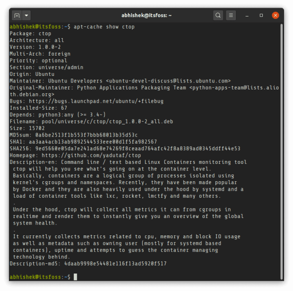 你可以看到软件包元数据中的所有细节,比如名称、版本、开发者、维护者、仓库、长短描述、软件包大小甚至是校验和。