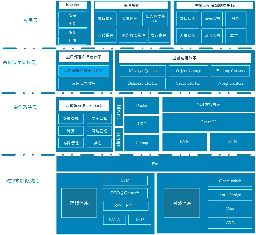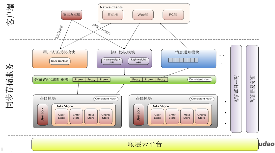 在整个云存储系统中,可以采用的开源技术,主要开发语言有:C、PHP、Erlang、Python,开源产品有:Nginx、GraphicsMagick、MySQL、Memcached、Hadoop、Redis、Squid、Heartbeat、IPVS BIND