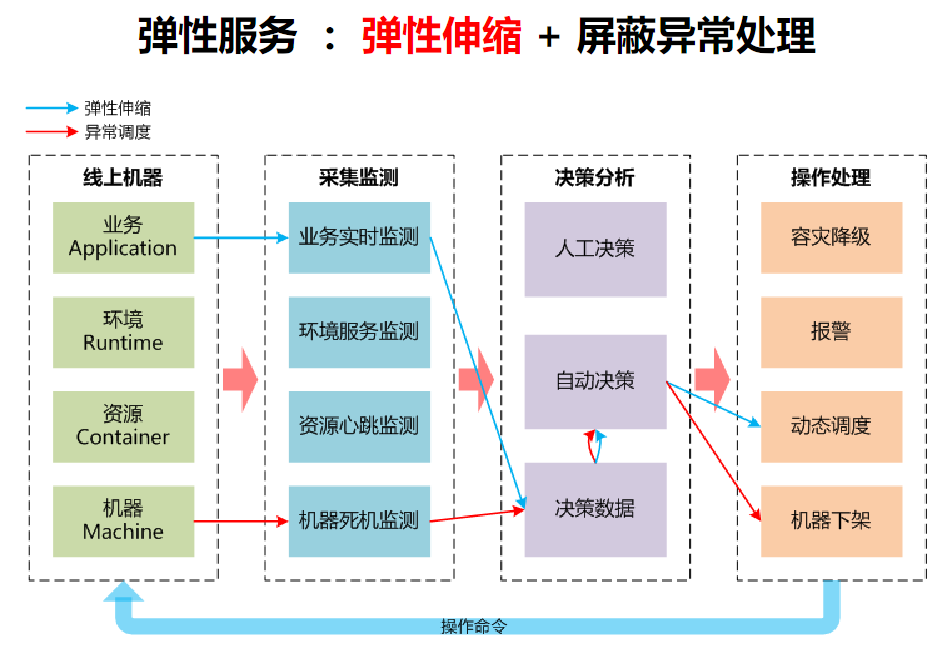 结合对弹性服务的理解,第一个是弹性伸缩,你让你的业务随着你的性能,随着你的流量,随着业务的变化自动的伸缩流量,这是第一个点。第二个点是我能够自动的屏蔽异常处理,我的机器出问题的时候,对业务是透明的,也是没有影响的。