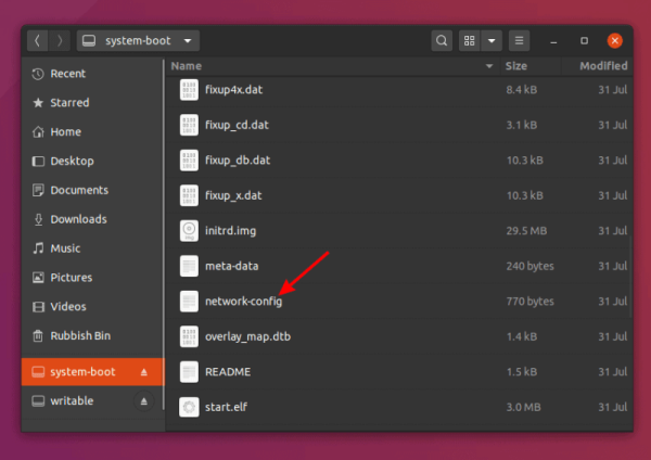 SD 卡仍然插入读卡器中,打开文件管理器,找到卡上的 “system-boot” 分区。