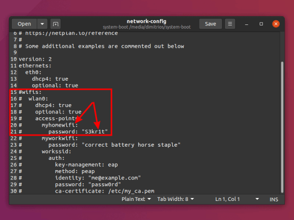 之后,将 myhomewifi 替换为你的 Wi-Fi 网络名,比如 "itsfoss",将 "S3kr1t" 替换为 Wi-Fi 密码,用引号括起来,比如 "12345679"。