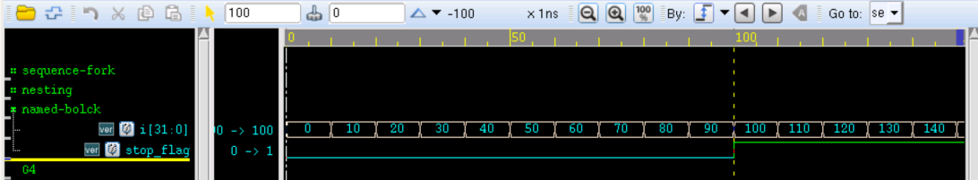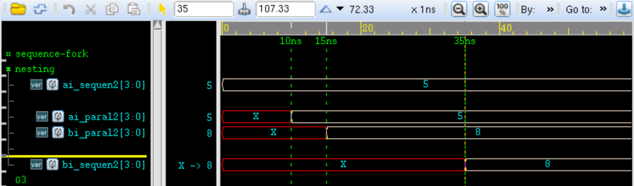 如图所示,顺序块顺序执行,第 10ns 时,信号 bi_sequen 才赋值为 8。