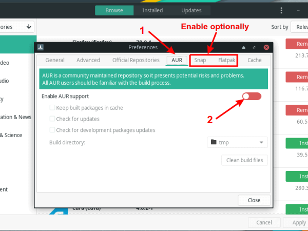 作为可选项,你可以直接在 Pacman 图形化软件包管理器中启用对 Snap 以及 Flatpak 的支持。