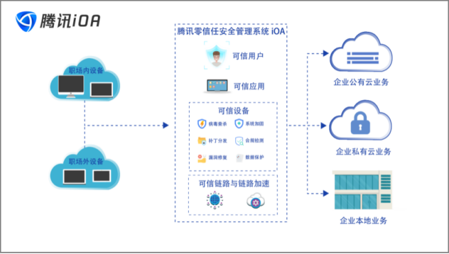 腾讯 iOA 整体方案如图 1 所示,通过在公司建立 iOA 零信任网络,实现以下安全能力: