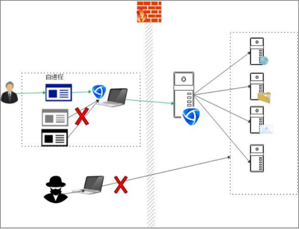 (1) 内外网远程办公场景:通过统一的业务安全访问通道,对网络访问进行终端、系统、应用、访问权限进行可信验证确认,极大减少企业内部资产被非授权访问的行为。