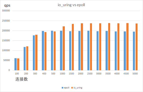 上图是io_uring和epoll在echo_server场景下qps数据对比,可以看出在笔者的测试环境中,连接数1000及以上时,io_uring的性能优势开始体现,io_uring的极限性能单core在24万qps左右,而epoll单core只能达到20万qps左右,收益在20%左右。