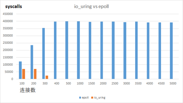上图统计的是io_uring和epoll在echo_server场景下系统调用上下文切换数量的对比,可以看出io_uring可以极大的减少用户态到内核态的切换次数,在连接数超过300时,io_uring用户态到内核态的切换次数基本可以忽略不计。