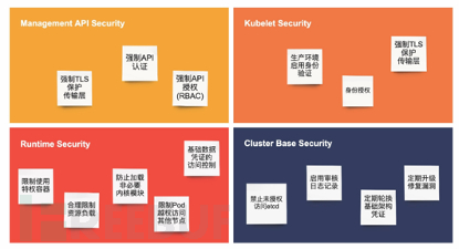 针对这两个主体的保护,我们的保护可以分为 4 大块:管理 API 的访问控制、Kubelet 的访问控制、Runtime(运行时)工作负载或用户功能的访问控制、集群组件的安全漏洞防护,如下图所示。