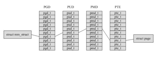 可以参考《CPU是如何访问内存的?》了解一级页表的概念,linux为了兼容32位和64位,通常采用四级页表,页全局目录,页上级目录,页中间目录,页表: