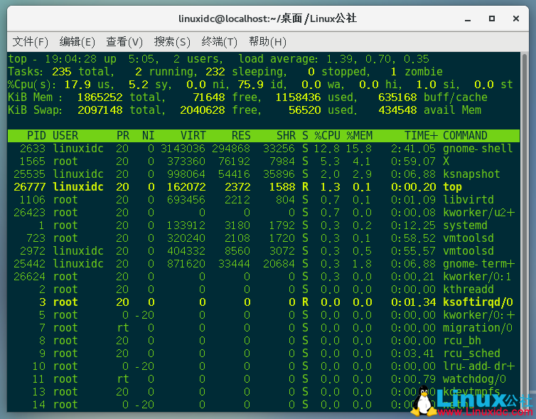 在输出的标题中,您可以看到KiB Mem和Kib Swap条目,通过它们可以检查已用和可用的内存资源。