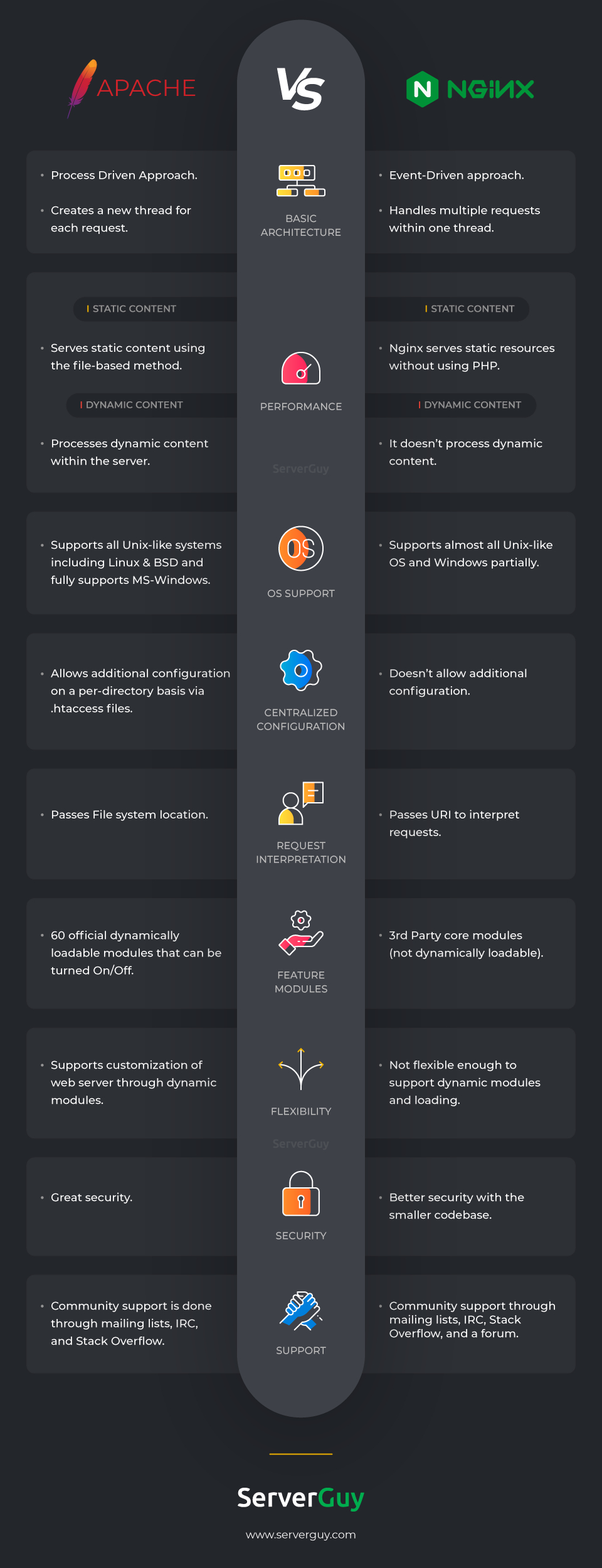 操作系统支持可能是需要考虑的重要一点,尤其是在比较 Apache 与 Nginx 时。但是,他们两个几乎相似在这里。
