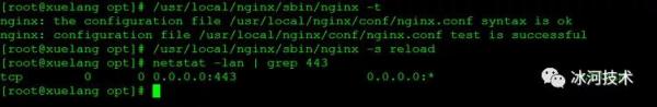 配置文件修改完毕后,用nginx -t 测试下配置无误,就reload一下nginx服务,检查443端口是否在监听:
