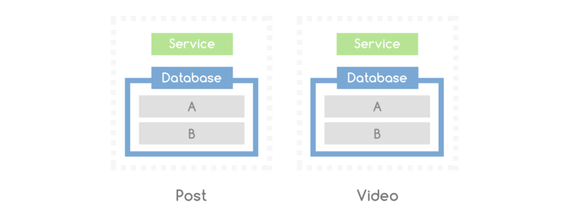 如图 Post 文章服务调用 Video 视频服务,需要通过最上层的 Service 之间相互调用。服务化明显改变: