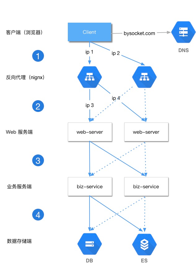 每次请求 bysocket.com 域名的时候,通过 DNS 轮询,返回对应的 ip 地址,每个 ip 对应的反向代理层的服务实例,也就是 nginx 的外网ip。这样可以做到每一个反向代理层实例得到的请求分配是均衡的。