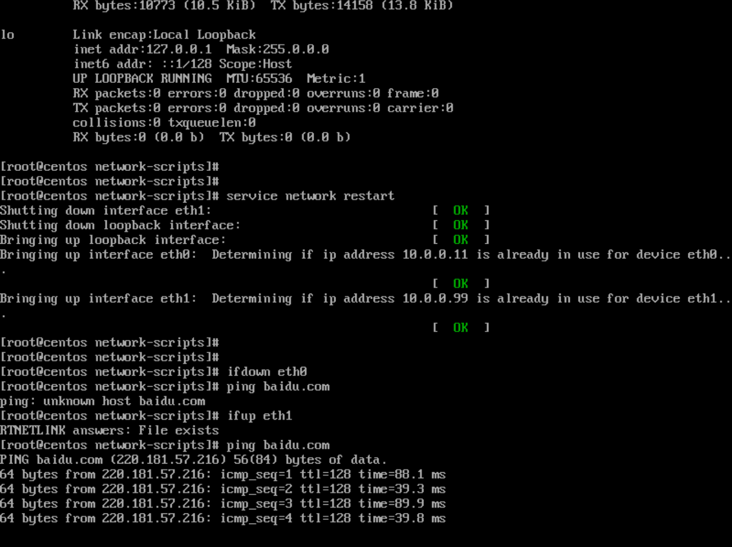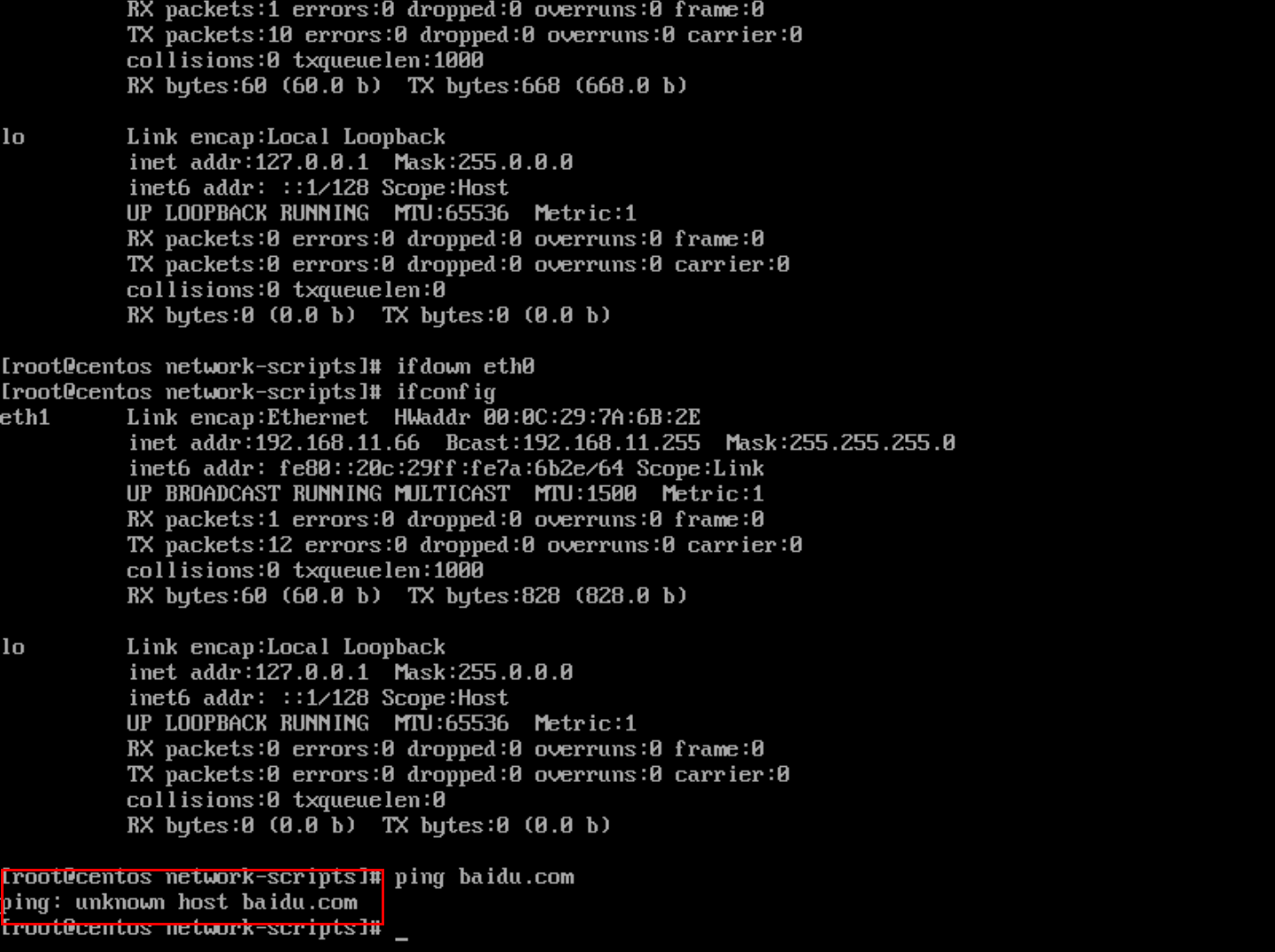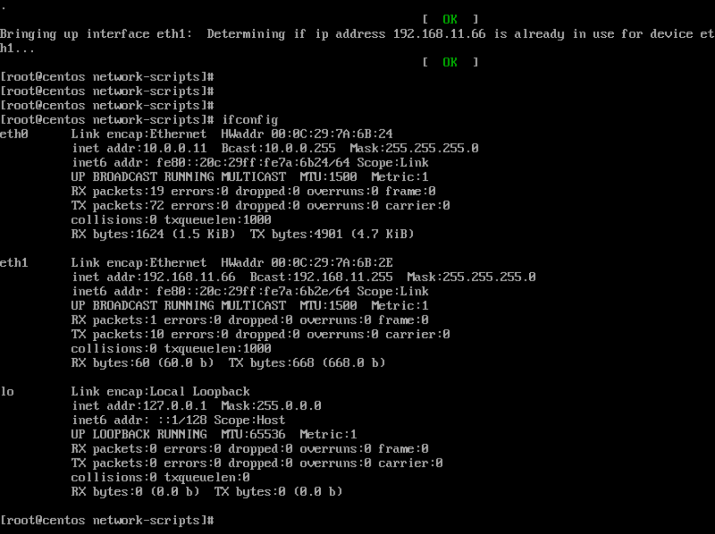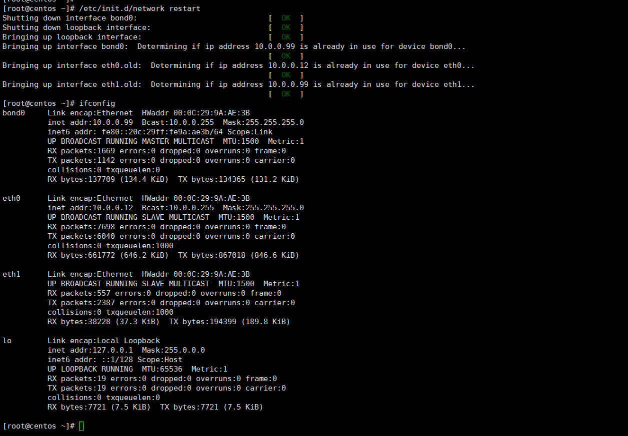 重启所有网卡(service network restart)后检查网卡