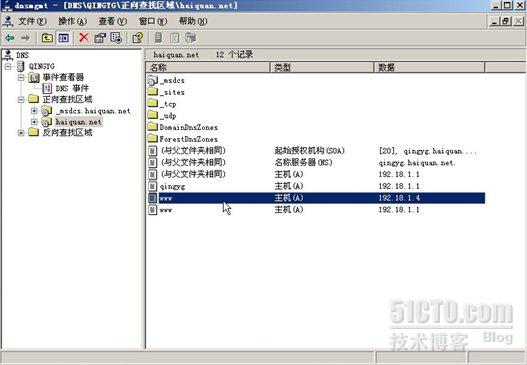 我们先看一下 WINDOWS2003下如何设置DNS轮询。比如:有两台WEB主机,A主机ip是 192.168.1.1,B主机ip是192.168.1.4 , 企业里有单独一台DNS服务器,然后在该DNS服务器的正向区域里(域名为haiquan.net)分别建立两个主机A记录,第一个主机记录的记录IP是 192.168.1.1, 第二个主机记录的记录IP是192.168.1.4,附图: