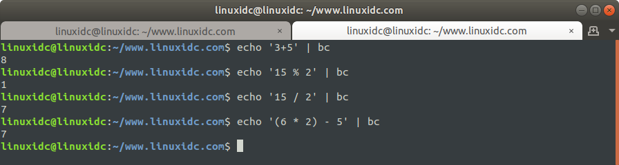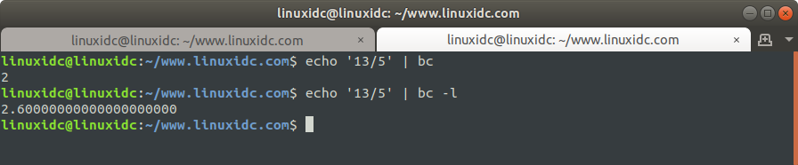 linuxidc@linuxidc:~/www.linuxidc.com$ echo '13/5' | bc 2 linuxidc@linuxidc:~/www.linuxidc.com$ echo '13/5' | bc -l 2.60000000000000000000
