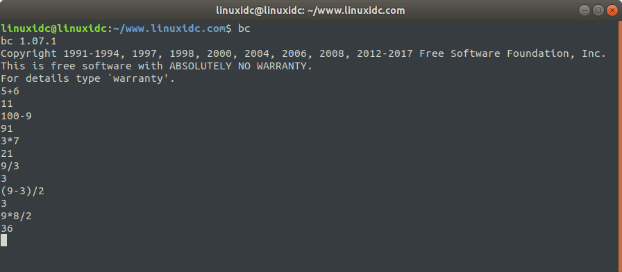 bc(基本计算器)是一个命令行实用程序,它提供了您希望从简单的科学或金融计算器中获得的所有功能。 它对于进行浮点数学运算特别有用。如果未安装bc命令,则可以使用以下命令安装: