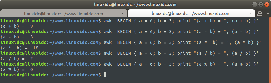 Awk是GNU/Linux中最着名的文本处理程序之一。 它支持加法,减法,乘法,除法和模数运算符。 它对于进行浮点数学运算也很有用。您可以使用它来执行基本数学运算,如图所示。