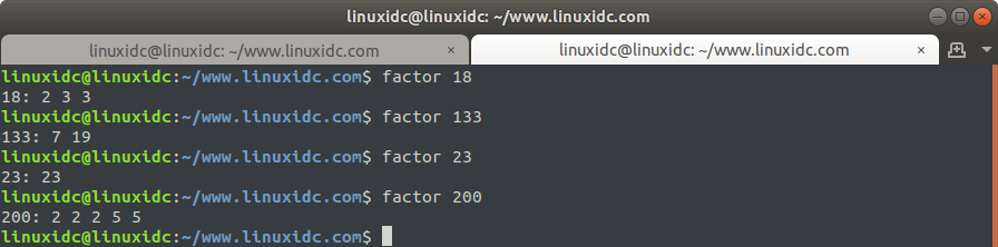 linuxidc@linuxidc:~/www.linuxidc.com$ factor 18 18: 2 3 3 linuxidc@linuxidc:~/www.linuxidc.com$ factor 133 133: 7 19 linuxidc@linuxidc:~/www.linuxidc.com$ factor 23 23: 23 linuxidc@linuxidc:~/www.linuxidc.com$ factor 200 200: 2 2 2 5 5