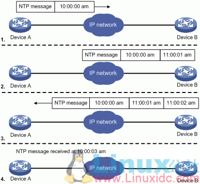 该图显示了NTP的基本工作原理。设备A和设备B通过网络连接。它们都有各自独立的系统时钟,并且它们需要通过NTP实现其系统时钟的自动同步。为了便于理解,进行以下假设: