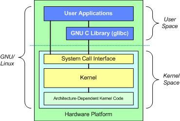 所有的用户应用程序都是在用户空间运行,它们不能直接访问内存等硬件资源,而是间接通过内核来访问。GNU C 库(glibc)提供了从用户空间切换至内核空间的机制。